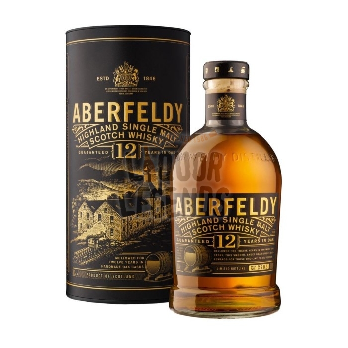 The classic 12 Year Old Aberfeldy single malt Scotch whisky. Distilled in the Highlands. While the label sadly no longer features a red squirrel. It now comes with a rather handsome black and rose-gold color palate to match the rich, malty flavor profile.