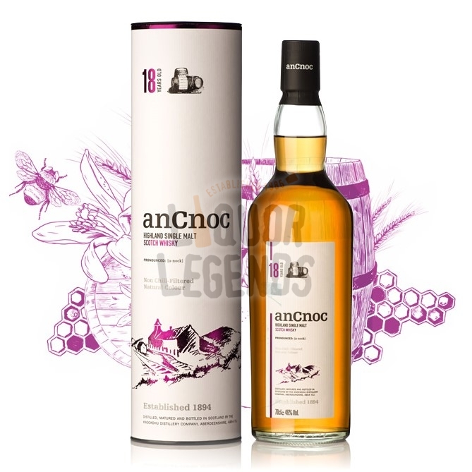 The anCnoc 18 Year Old has matured in Spanish oak ex-sherry casks and American oak ex-bourbon barrels and has been bottled in its most natural form, neither chill-filtered nor coloured. As a result this dram may develop a light haze with the addition of water or if kept at a cold temperature. This haze is a natural characteristic of whisky that is non chill-filtered.