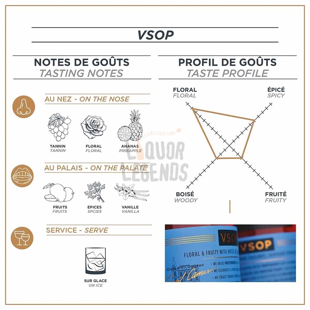 CAMUS VSOP is an intensely aromatic cognac, whose floral and fruity profile with notes of oak, spice and vanilla derive from a careful selection of the eaux-de-vie reflecting the quintessential flavours of the Terroir, some of which coming from the renowned Cru of Borderies. All the barrels used for the ageing are exclusively "fine grain” and low in tannins, thanks to the peculiar ‘French Light Toasting’ process, allowing to balance oakiness with fresh flavors.