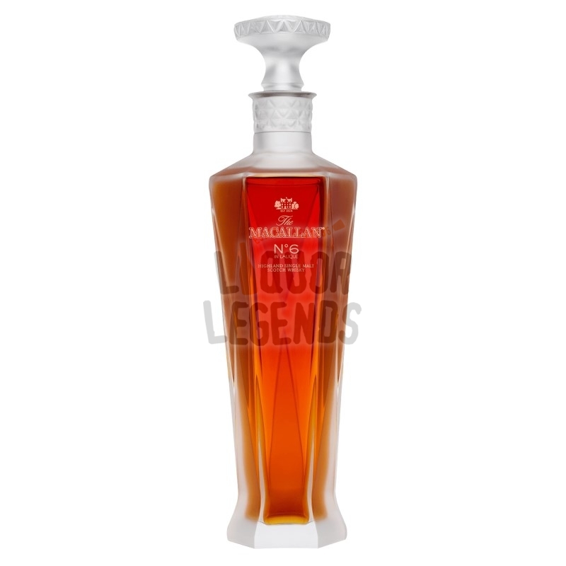 No. 6 brings together the art of whisky making with Lalique exquisite craftsmanship to create a stunning whisky encased in the finest crystal decanter. This rich, complex single malt takes its unique natural colour and character from first fill sherry seasoned oak casks from Spain, handcrafted by the master craftsmen of Jerez de la Frontera, the home of sherry. The casks are taken from a single cooperage in order to ensure the infinite quality and character at the heart of this rich single malt. The cooperage exclusively creates Spanish oak casks which, once seasoned with sherry, create the unique flavour of this exquisite whisky. Rich in spice and dried fruit with a layer of heady orange groves, this is an enticing, dark, whisky that delivers classic Macallan character.