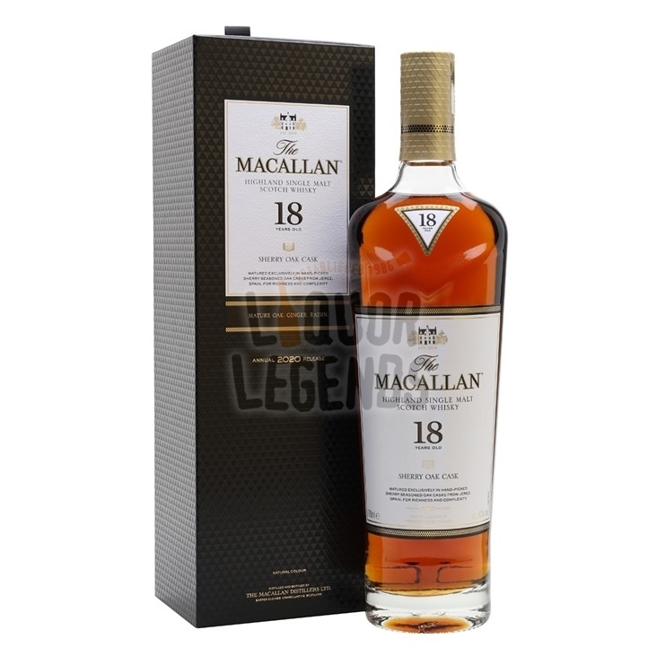 The Macallan Sherry Oak 18 Years Old forms part of our Sherry Oak range which features a series of single malt whiskies matured exclusively in hand-picked sherry seasoned oak casks from Jerez for richness and complexity. A full bodied palate of mature oak, ginger and raisin flavours is complimented by a light mahogany natural colour.